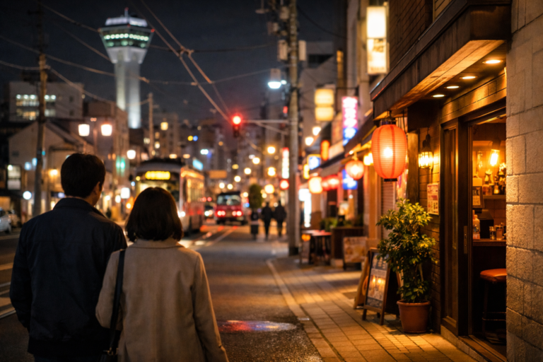 函館の本町周辺が使いやすいのは、市電で動きやすく、五稜郭公園前の電停を起点に飲食店がまとまっているからです。函館駅前から市電でアクセスしやすく、観光帰りでも流れを切らずに夜へつなげやすいのが強みです。