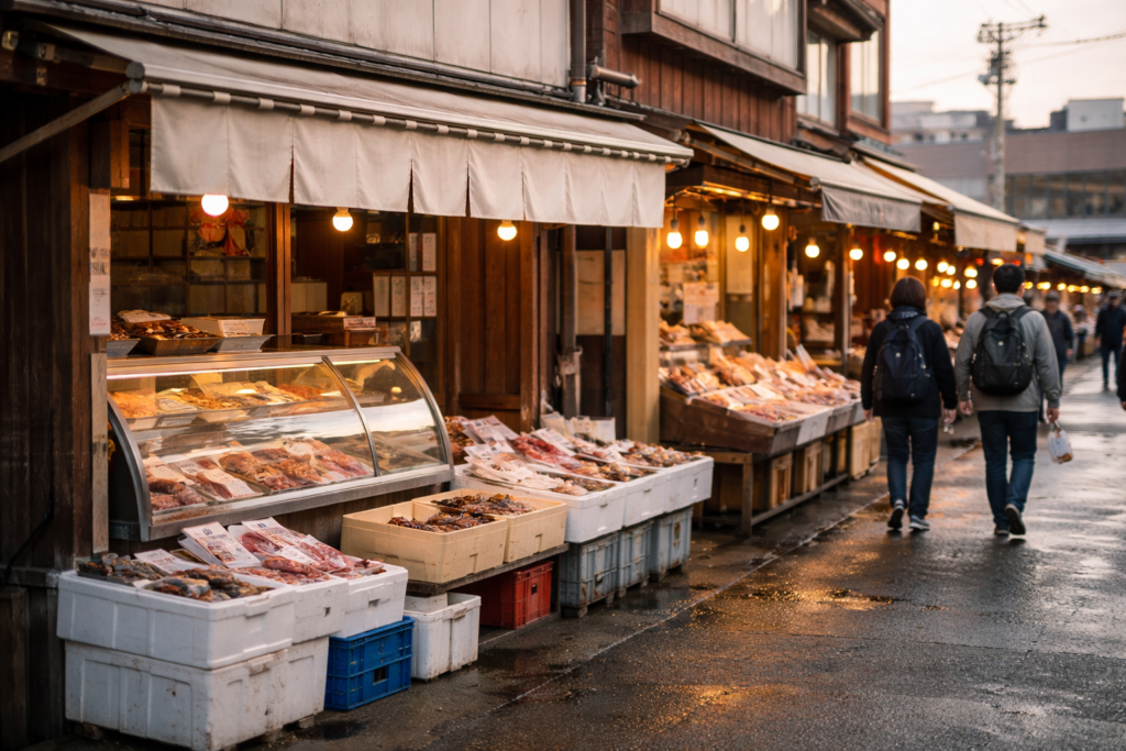 函館朝市には海鮮丼や乾物、みやげ店がずらりと並びますが、そのなかでひと目で印象に残りやすいのが函館くじら屋です。少し珍しい店に見えても、商品は意外と選びやすく、家庭用にもおみやげ用にも手を伸ばしやすいのが魅力です。まずは店の特徴から整理していきます。