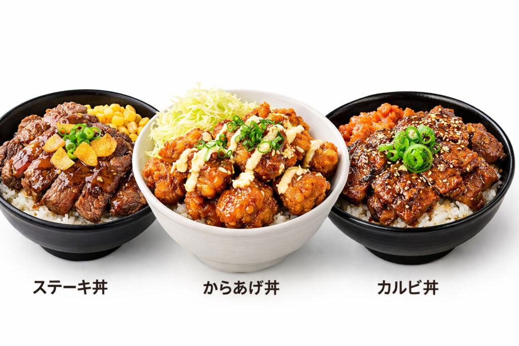 | ステーキ系 | 牛ロースステーキ丼、牛ガーリックステーキ丼 | 肉感をしっかり楽しみたい人 |